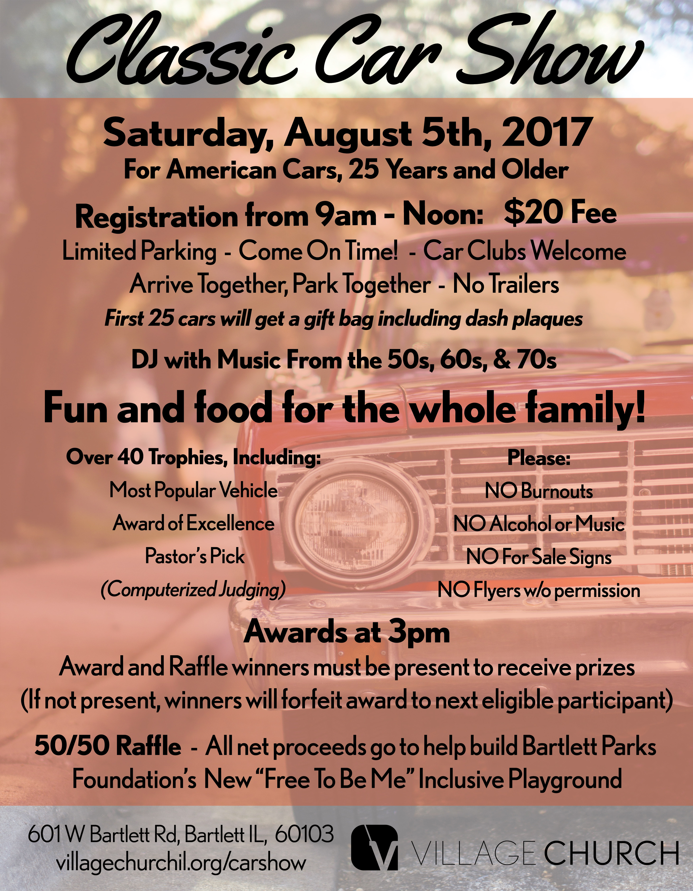 Village Church of Bartlett invites you to its first annual Classic Car Show for American cars 25 years and older. Registration for participants is from 9 a.m. to noon, $20 fee. Car clubs are welcome. First 25 cars will get a gift bag, including dash plaques. Awards (more than 40 trophies) at 3 p.m.