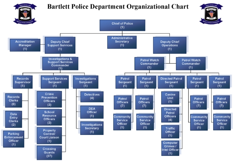 The Police Department provides for the public safety and welfare of Bartlett residents and visitors. To efficiently deliver its many programs and services, the Police Department is divided into two divisions, each of which is under the command of a Deputy Chief. These divisions are Support Services and Operations.